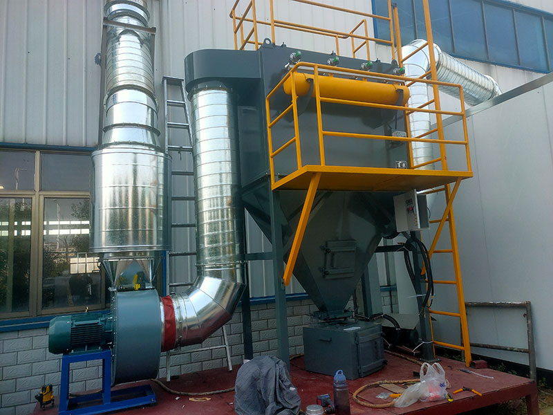 含塵氣體由除塵器下部進氣口進入除塵器內(nèi)部的過程中,其中較大顆粒(直 徑 100μm),首先被沉降;較小顆粒(直徑 0.1~50μm)在空氣處理室被吸附在濾筒表面。穿過濾筒的凈化空氣經(jīng)排氣室排出。當設(shè)備運行阻力達到一定時,脈沖
